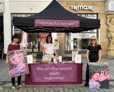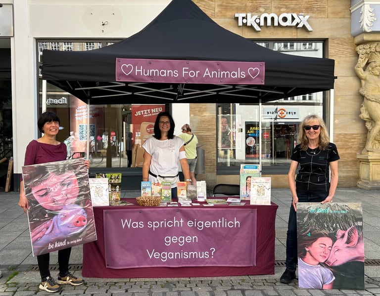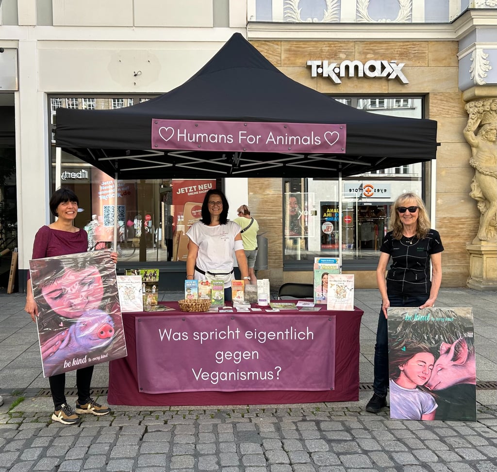 Auf der Straße leisten wir Aufklärungsarbeit rund um das Thema Veganismus und verbinden diese mit praktischer Tierschutzarbeit. Uns geht es nicht nur darum, sichtbar zu machen, welches Leid wir Menschen den anderen Tieren zufügen, sondern auch dabei Hilfestellung zu geben, ein veganes Leben in den Alltag zu integrieren.